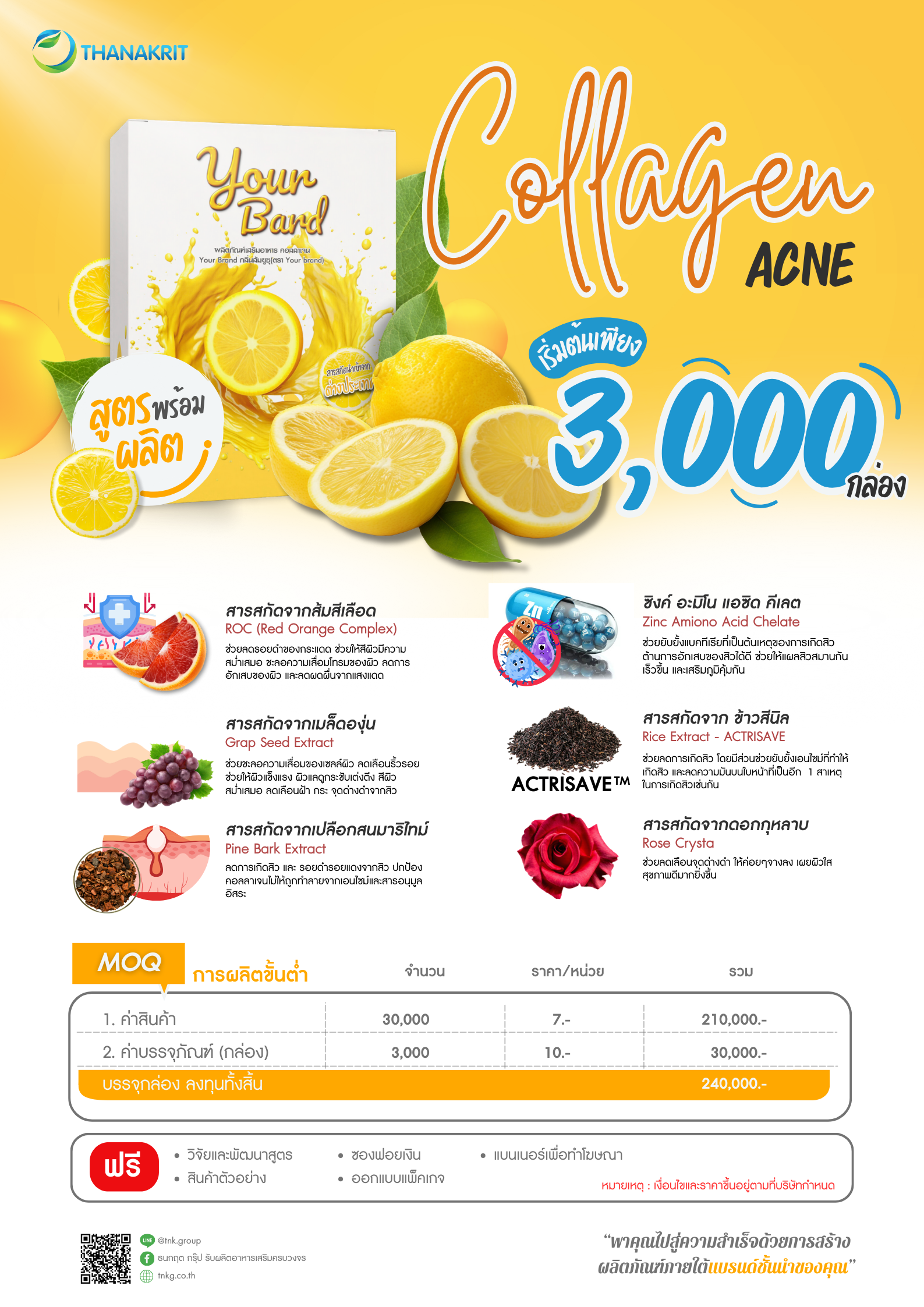 คอลลาเจนเสริมอาหารเพื่อฟื้นฟูและบำรุงผิว ช่วยลดการอักเสบของสิว ซ่อมแซมผิวที่เสียหาย ลดรอยดำ รอยแดง และรอยแผลเป็นจากสิว พร้อมเติมความชุ่มชื้นให้ผิวเรียบเนียน กระจ่างใส ควบคุมความมันส่วนเกิน ลดโอกาสการเกิดสิวใหม่ เหมาะสำหรับผู้ที่ต้องการดูแลผิวให้แข็งแรงและสุขภาพดี